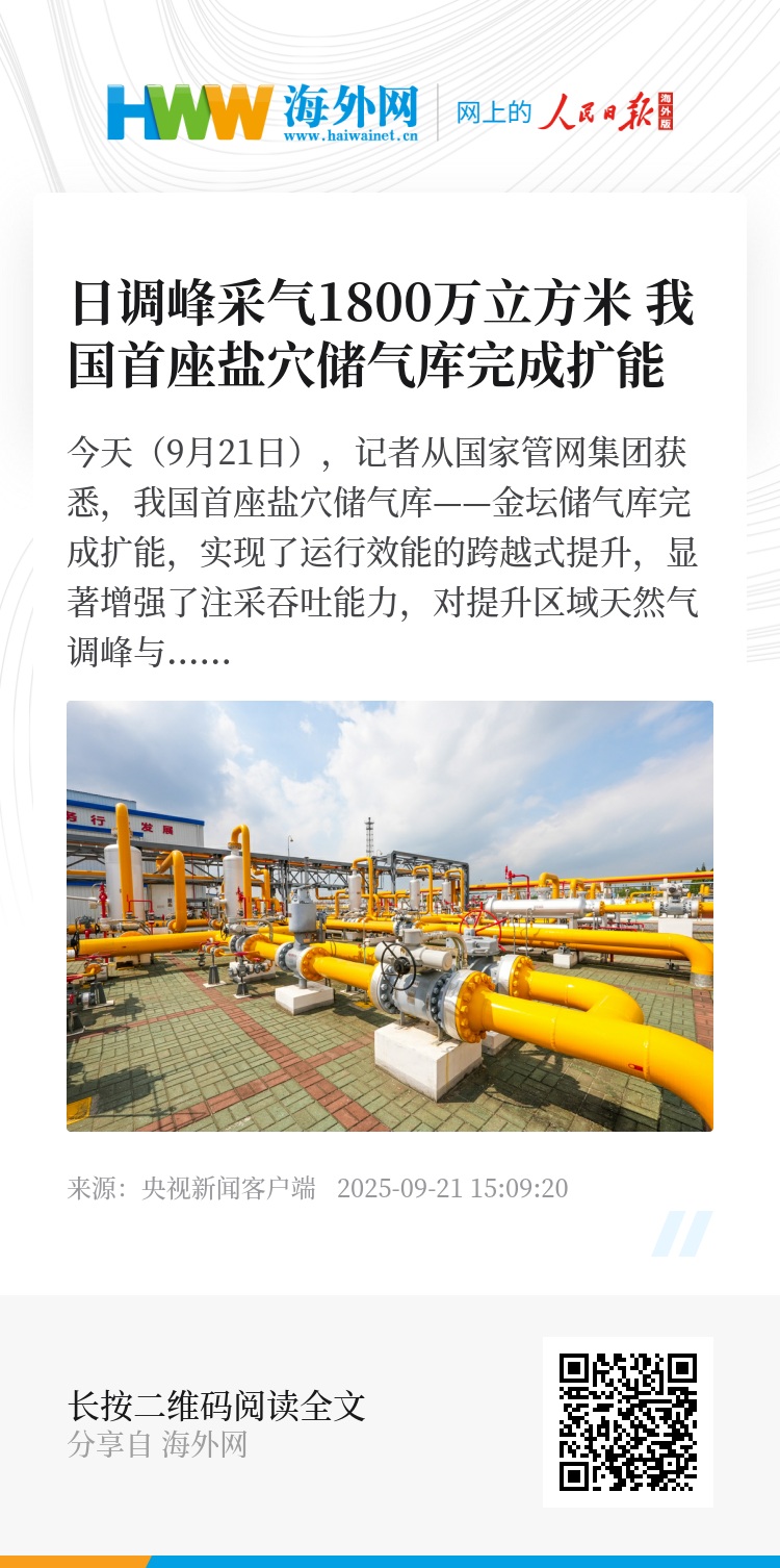 今天(9月21日),记者从国家管网集团获悉,我国首座盐穴储气库——金坛储气库完成扩能,实现了运行效能的跨越式提升,显著增强了注采吞吐能力,对提升区域天然气调峰与应急保供水平具有重要意义。