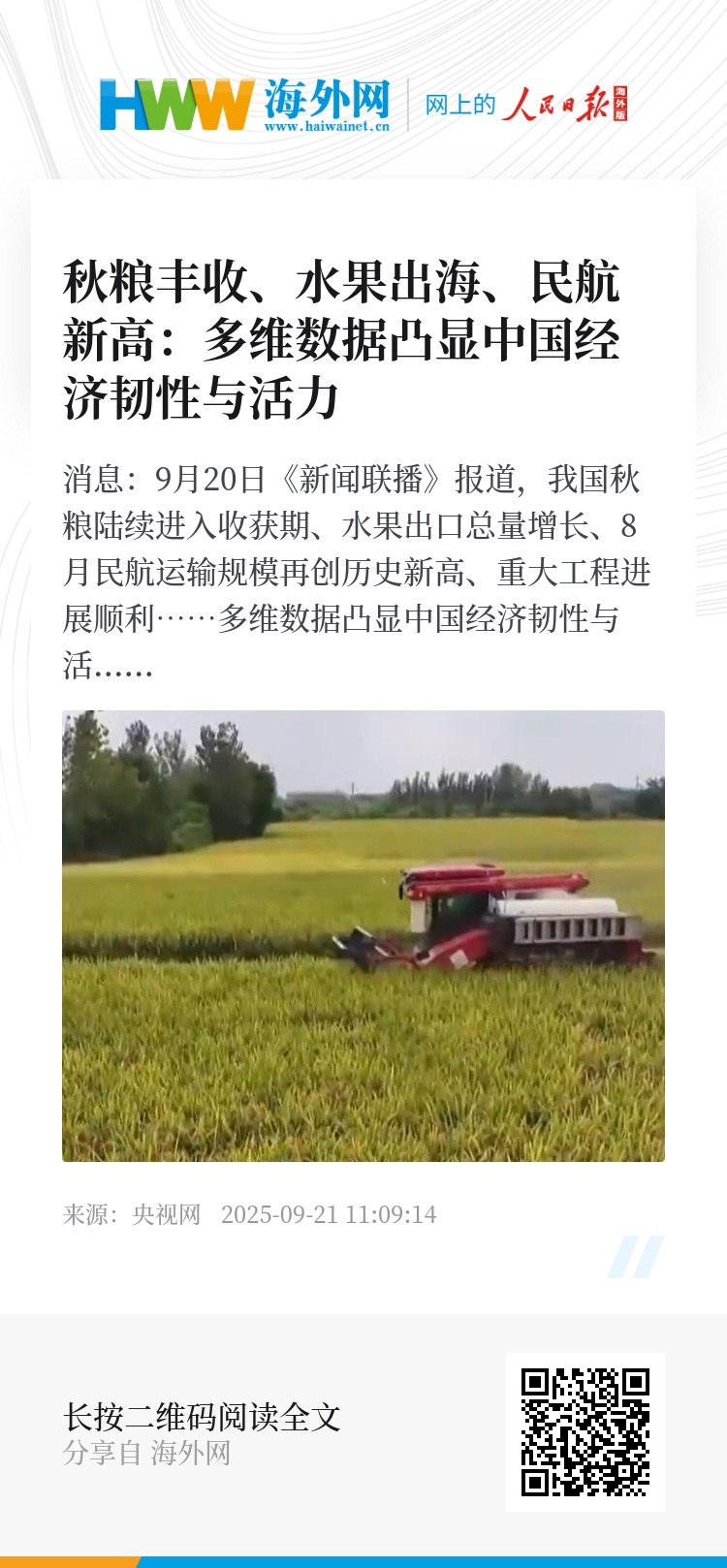 央视网消息:9月20日《新闻联播》报道,我国秋粮陆续进入收获期、水果出口总量增长、8月民航运输规模再创历史新高、重大工程进展顺利……多维数据凸显中国经济韧性与活力。