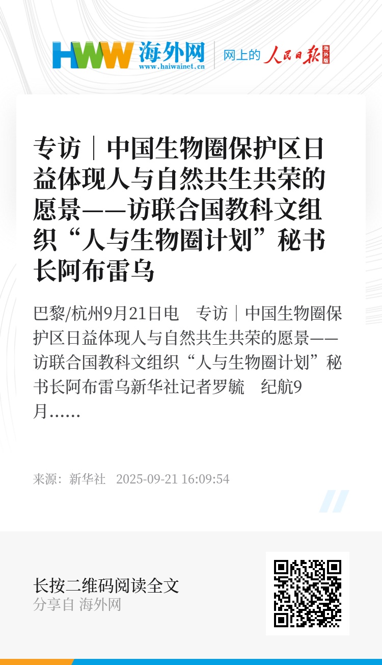 新华社巴黎/杭州9月21日电 专访|中国生物圈保护区日益体现人与自然共生共荣的愿景——访联合国教科文组织“人与生物圈计划”秘书长阿布雷乌
