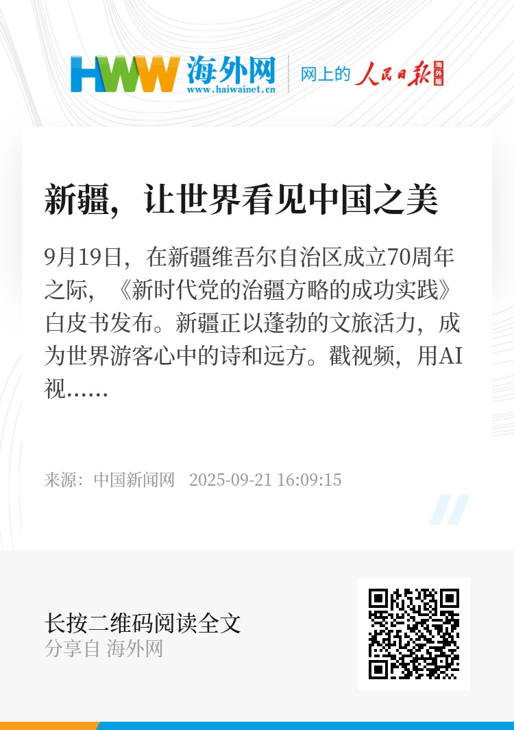 9月19日,在新疆维吾尔自治区成立70周年之际,《新时代党的治疆方略的成功实践》白皮书发布。新疆正以蓬勃的文旅活力,成为世界游客心中的诗和远方。戳视频,用AI视角打开新疆,让世界看见中国之美。