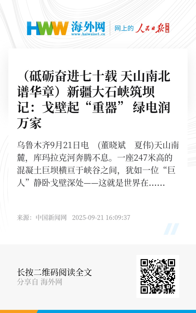 中新网乌鲁木齐9月21日电 (董晓斌 夏伟)天山南麓,库玛拉克河奔腾不息。一座247米高的混凝土巨坝横亘于峡谷之间,犹如一位“巨人”静卧戈壁深处——这就是世界在建最高的混凝土面板砂砾石坝:新疆大石峡水利枢纽工程。