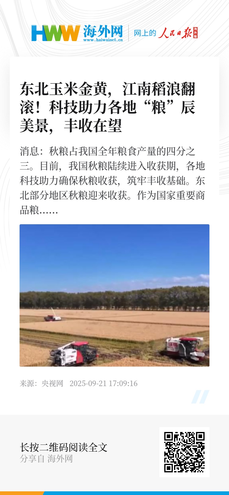 央视网消息:秋粮占我国全年粮食产量的四分之三。目前,我国秋粮陆续进入收获期,各地科技助力确保秋粮收获,筑牢丰收基础。