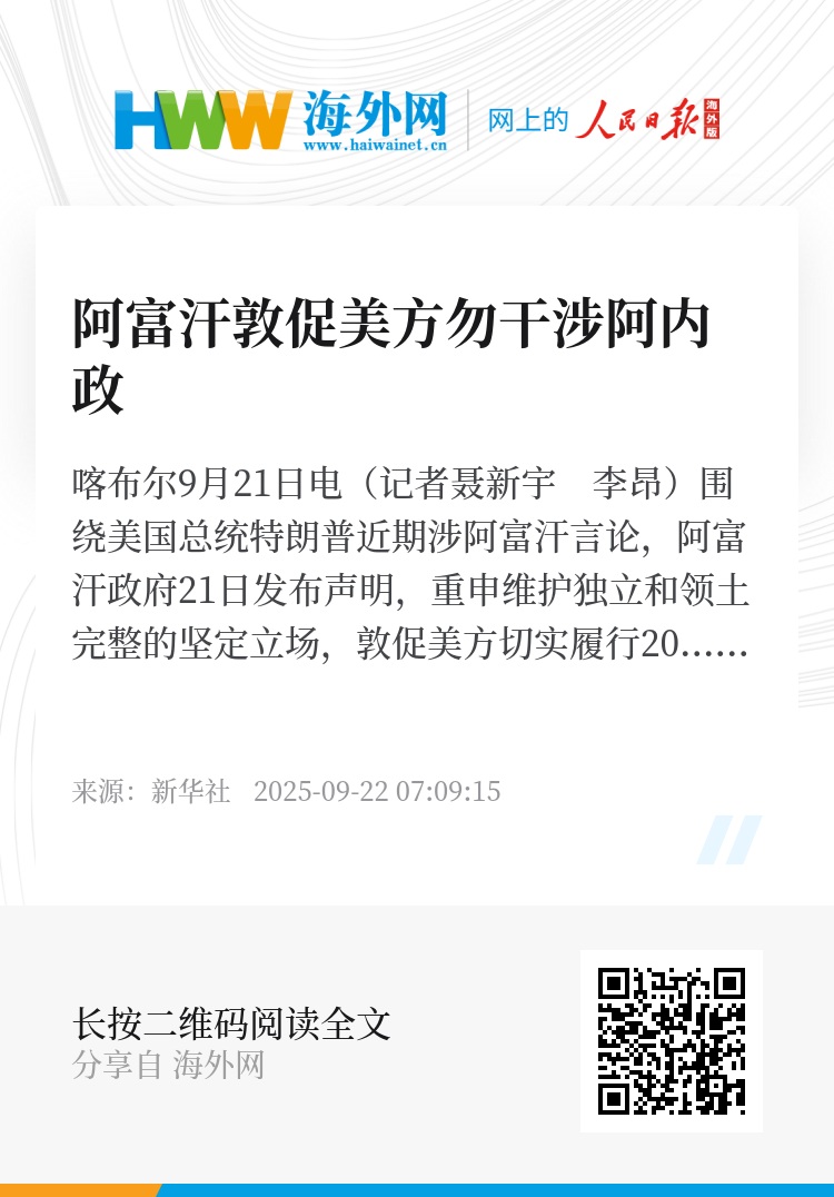 新华社喀布尔9月21日电(记者聂新宇 李昂)围绕美国总统特朗普近期涉阿富汗言论,阿富汗政府21日发布声明,重申维护独立和领土完整的坚定立场,敦促美方切实履行2020年多哈协议中“不干涉阿富汗内政”等承诺。