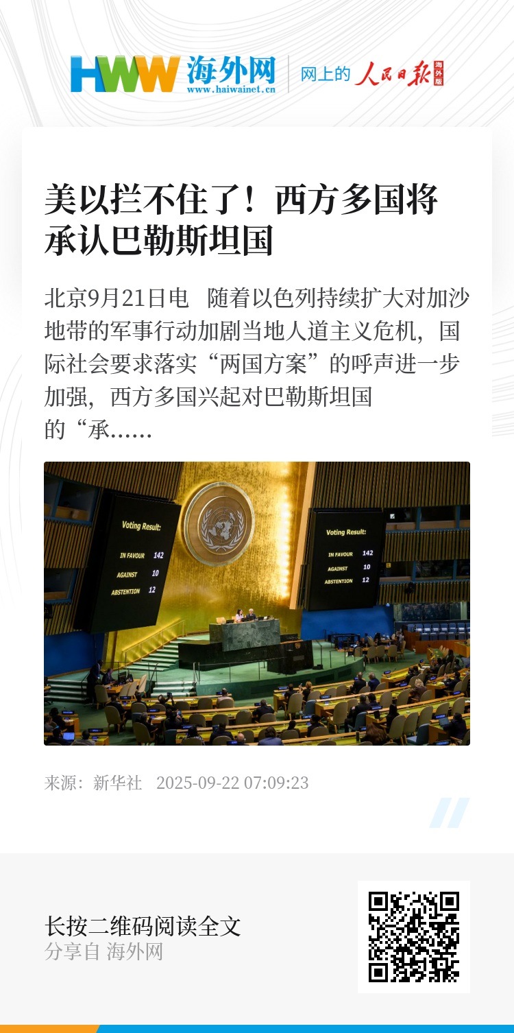 新华社北京9月21日电 随着以色列持续扩大对加沙地带的军事行动加剧当地人道主义危机,国际社会要求落实“两国方案”的呼声进一步加强,西方多国兴起对巴勒斯坦国的“承认潮”。与此同时,以色列与美国在国际上愈发孤立。