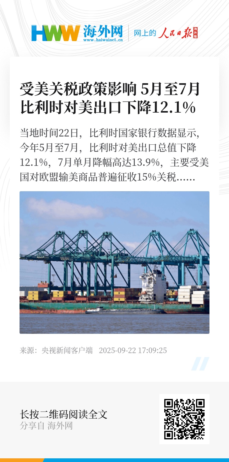 当地时间22日,比利时国家银行数据显示,今年5月至7月,比利时对美出口总值下降12.1%,7月单月降幅高达13.9%,主要受美国对欧盟输美商品普遍征收15%关税影响。