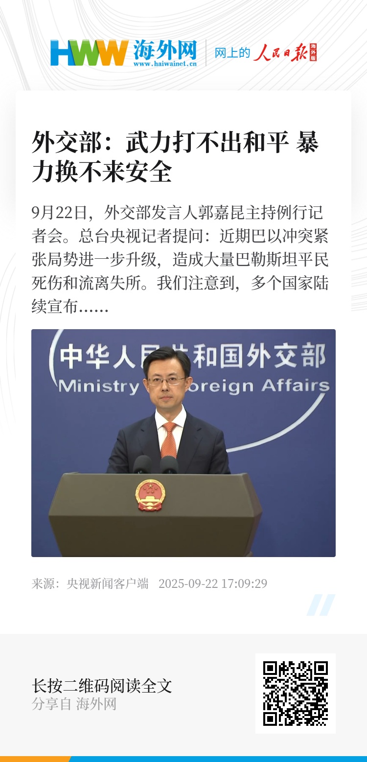 9月22日,外交部发言人郭嘉昆主持例行记者会。总台央视记者提问:近期巴以冲突紧张局势进一步升级,造成大量巴勒斯坦平民死伤和流离失所。我们注意到,多个国家陆续宣布承认巴勒斯坦国,其中不乏英国、加拿大、澳大利亚等西方国家。但同时,美国仍然在向以色列出售武器装备,并宣称同海湾国家商讨战后加沙临时治理架构。中方对此有何评论?
