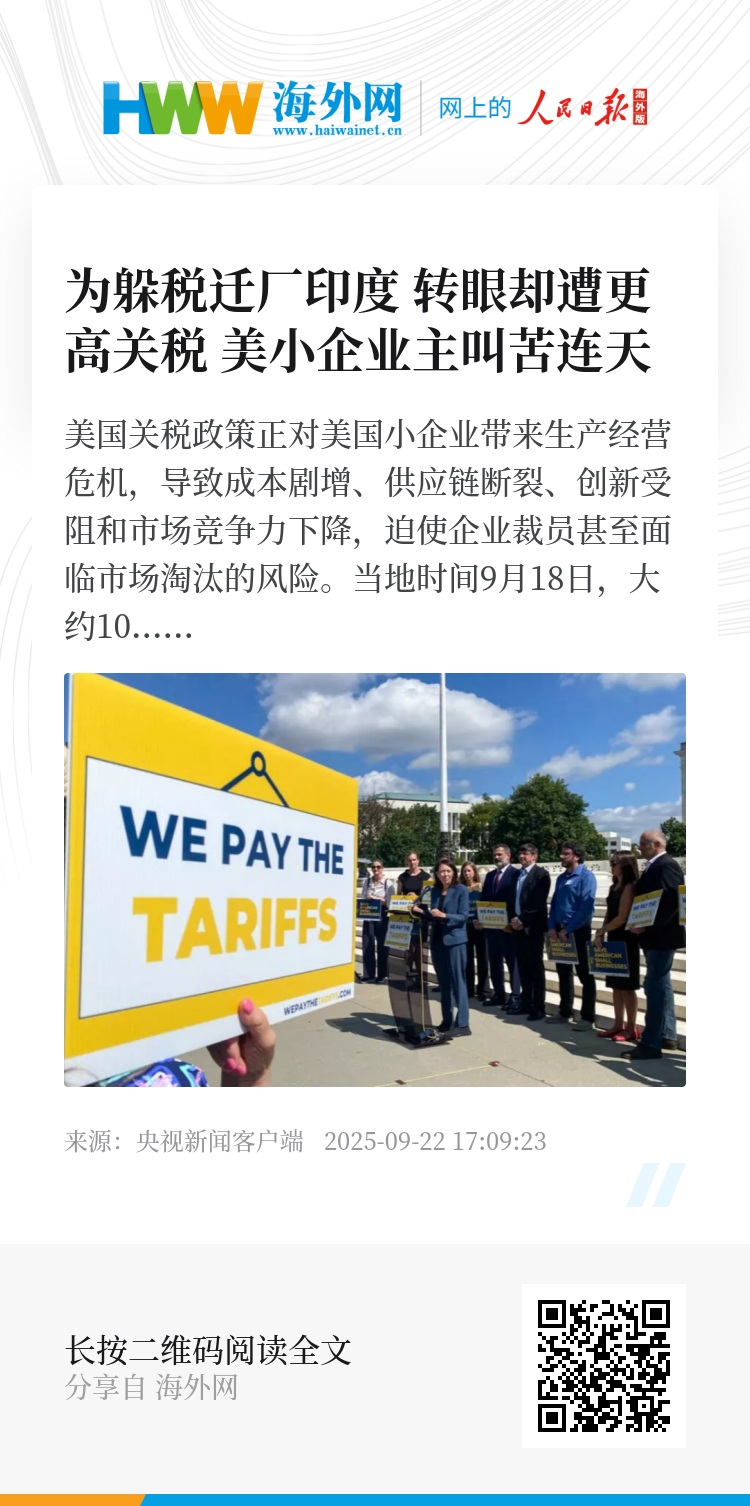 美国关税政策正对美国小企业带来生产经营危机,导致成本剧增、供应链断裂、创新受阻和市场竞争力下降,迫使企业裁员甚至面临市场淘汰的风险。当地时间9月18日,大约100名小企业主聚集在美国首都华盛顿特区,控诉特朗普政府征收的广泛关税对其生计造成的影响。