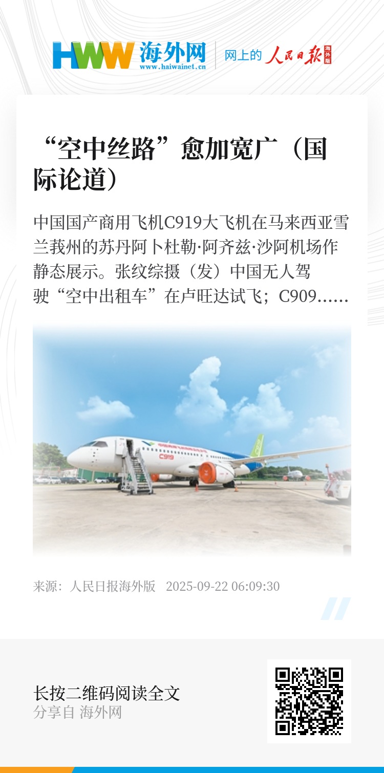 中国无人驾驶“空中出租车”在卢旺达试飞;C909飞机在印度尼西亚、越南、老挝等东盟国家投入运营;吉隆坡国际机场与郑州新郑国际机场加强“双枢纽”合作;吉尔吉斯斯坦比什凯克与中国新疆维吾尔自治区喀什市之间开通客运新航线……近段时间,空中丝绸之路建设成为外媒聚焦的热点。
