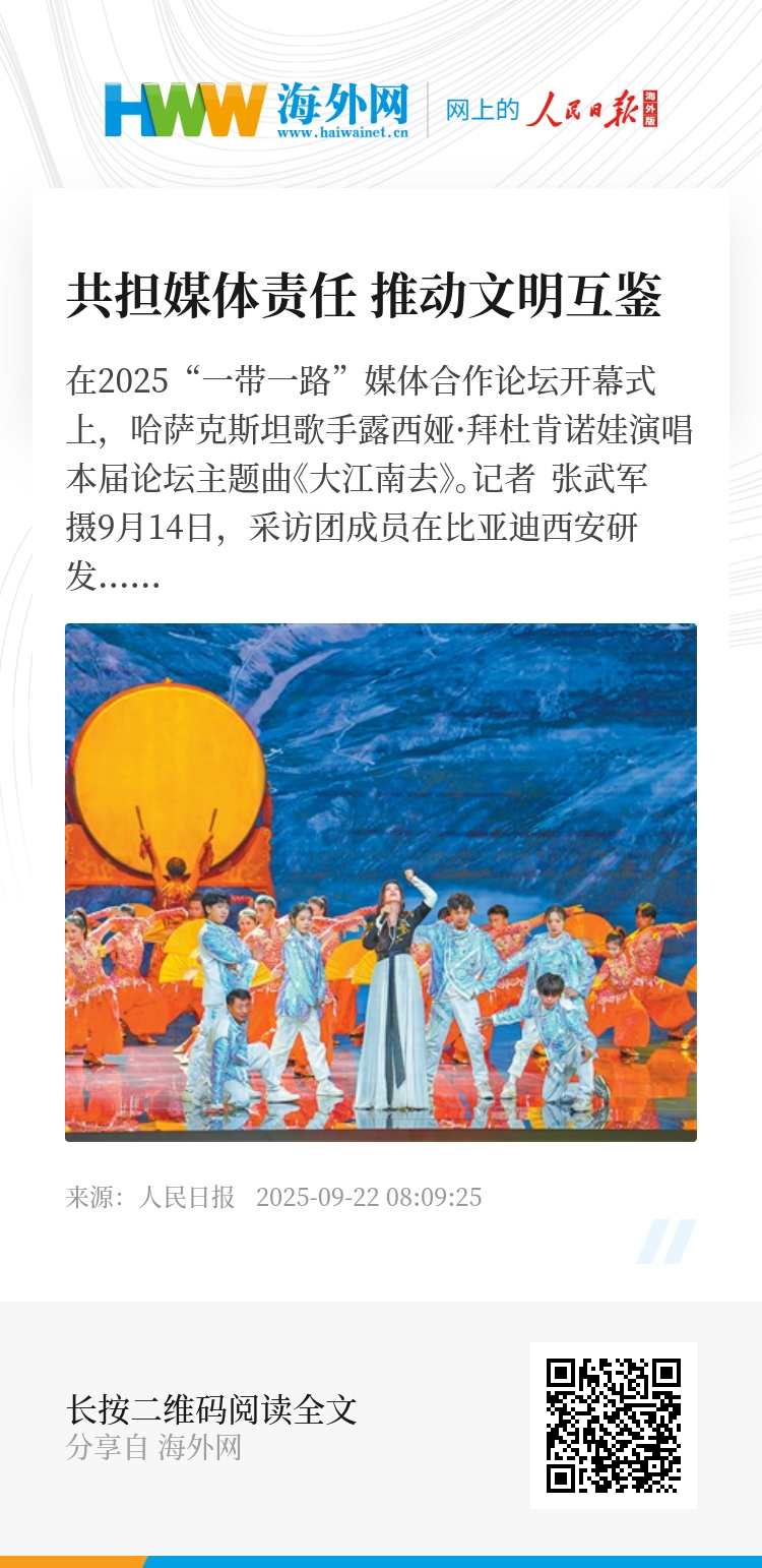 在2025“一带一路”媒体合作论坛开幕式上,哈萨克斯坦歌手露西娅·拜杜肯诺娃演唱本届论坛主题曲《大江南去》。