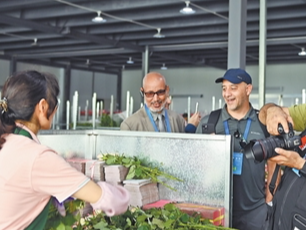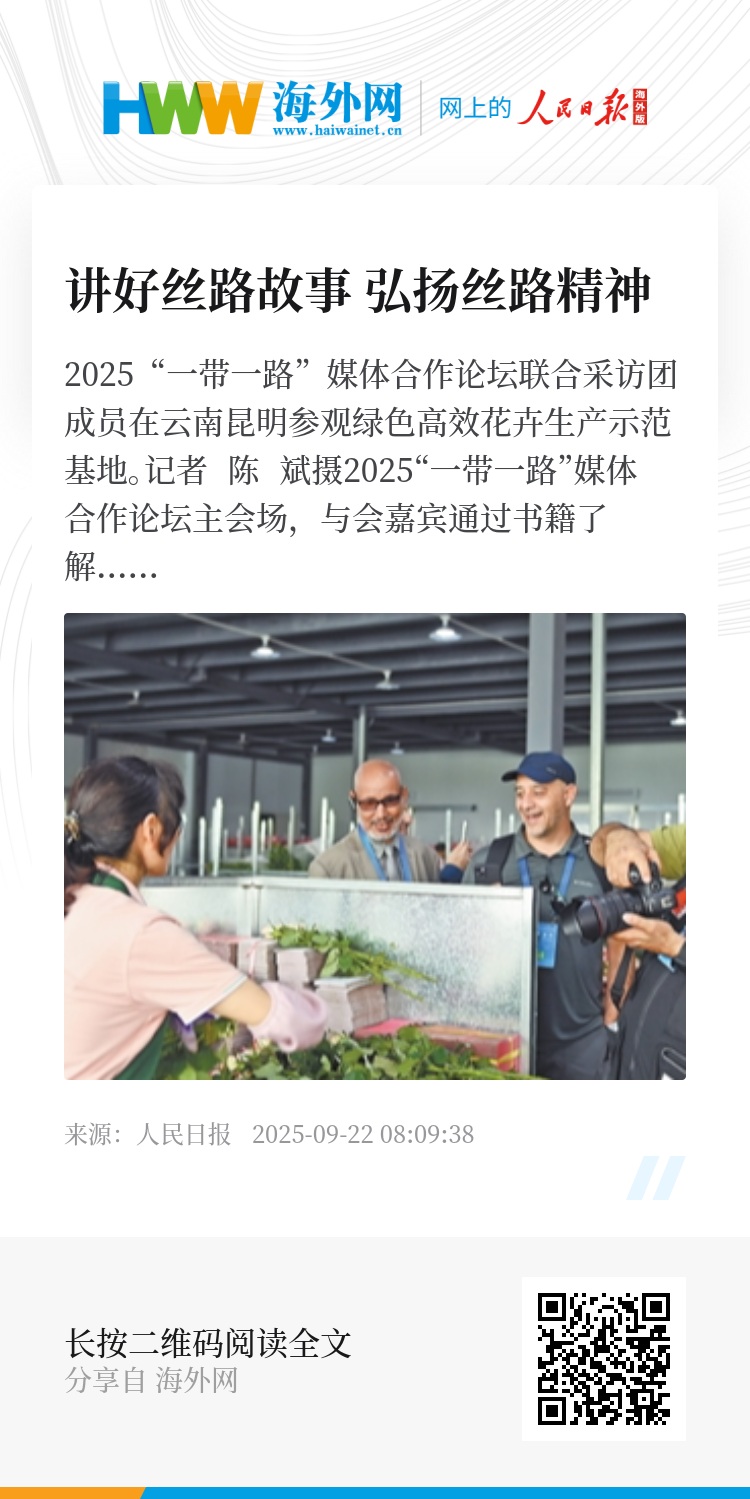 2025“一带一路”媒体合作论坛联合采访团成员在云南昆明参观绿色高效花卉生产示范基地。