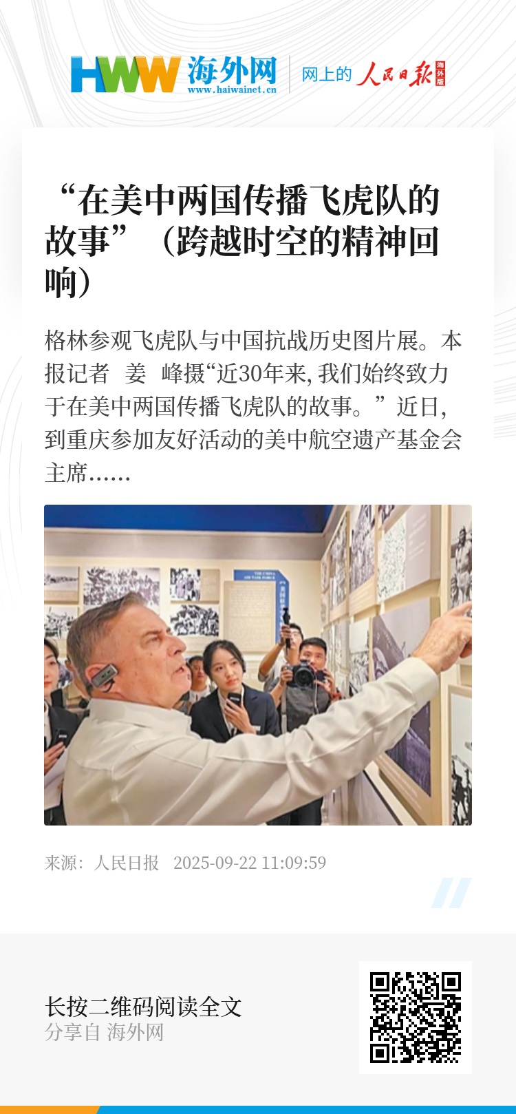 “我的父亲是一名二战老兵,小时候父亲给我讲了很多二战故事,我最爱听的就是飞虎队。”格林说,“飞虎队与中国军民并肩作战的历史,承载着两国的共同记忆,至今仍是连接美中人民的重要纽带。”1998年,格林发起成立美中航空遗产基金会,致力于传播飞虎队的故事,增进两国人民的理解和友谊。在基金会的组织下,近500名飞虎队老兵和数百名老兵家属到访中国。2023年9月,习近平主席复信格林和飞虎队老兵莫耶、麦克马伦,向他们表达敬意。