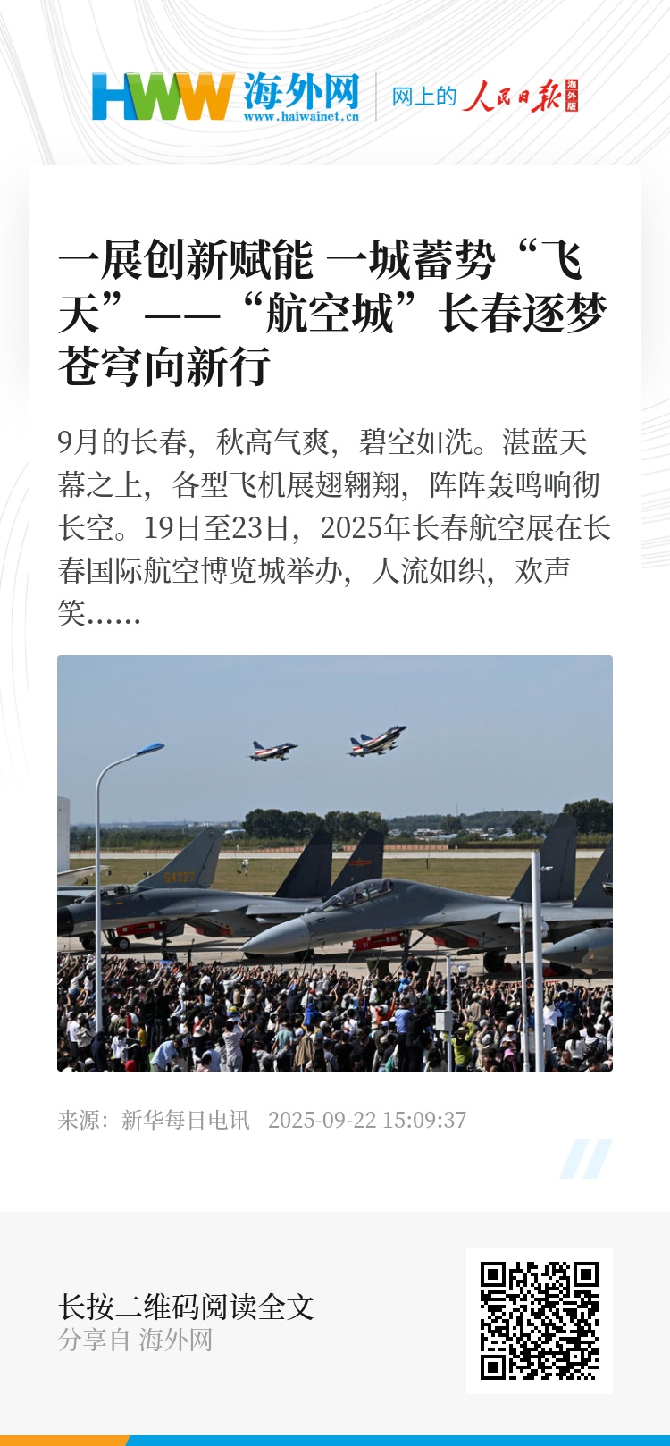 9月的长春,秋高气爽,碧空如洗。湛蓝天幕之上,各型飞机展翅翱翔,阵阵轰鸣响彻长空。19日至23日,2025年长春航空展在长春国际航空博览城举办,人流如织,欢声笑语,北国春城又一次热闹起来。