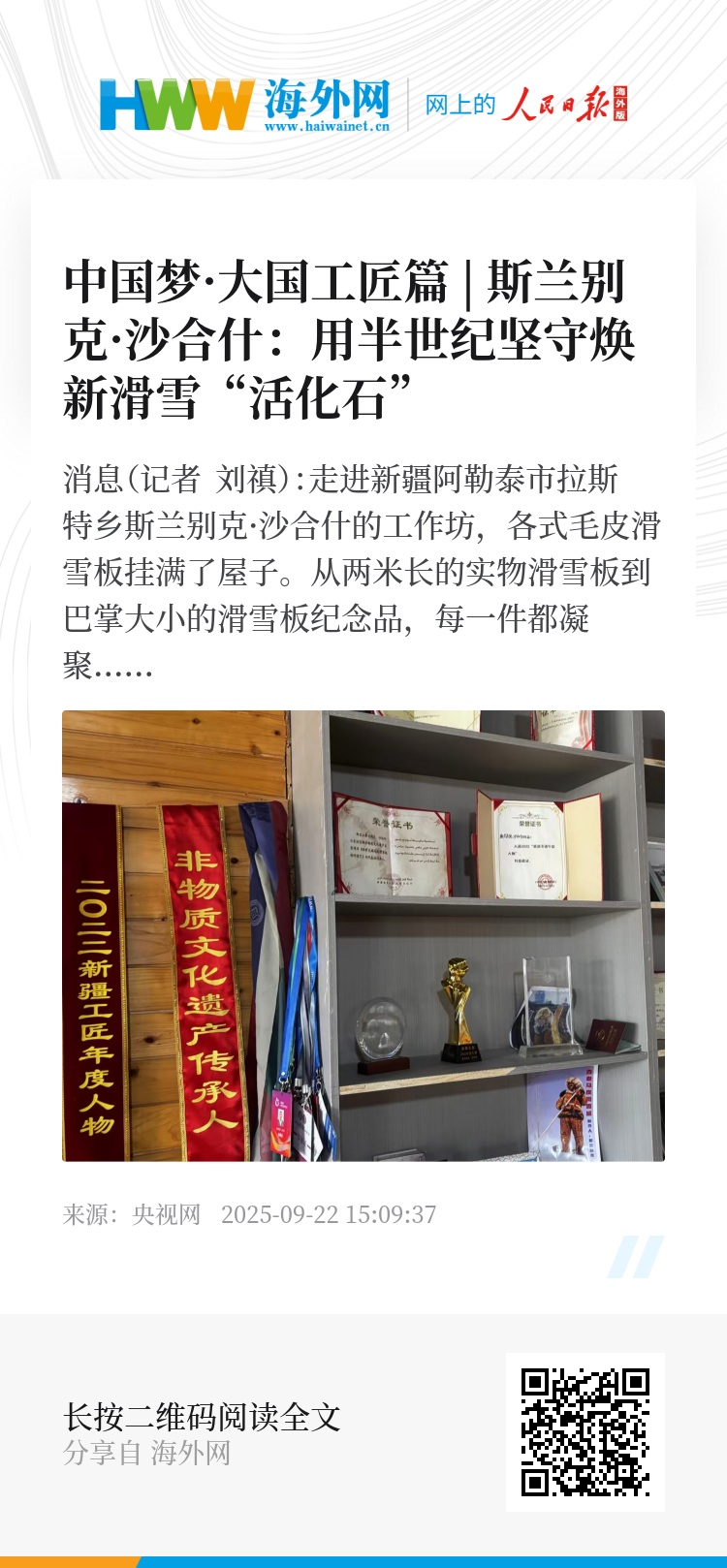 每年到了雪季,将军山雪场上,无数滑雪爱好者踏着现代雪板驰骋而下;而在山脚下这间温暖的工作坊里,斯兰别克依然守护着毛皮滑雪板制作这项已传承万年的冰雪技艺。新旧碰撞间,阿勒泰的冰雪故事正在书写新的传奇。