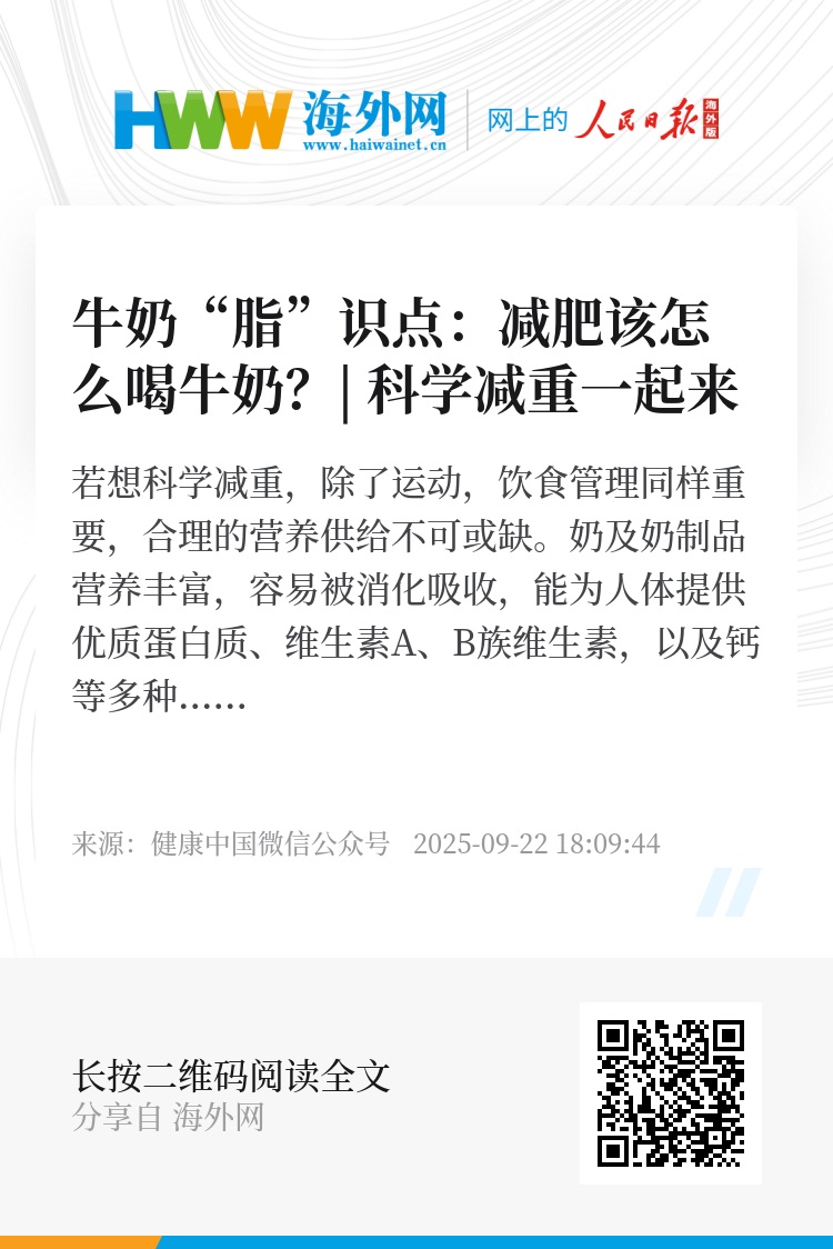 若想科学减重,除了运动,饮食管理同样重要,合理的营养供给不可或缺。奶及奶制品营养丰富,容易被消化吸收,能为人体提供优质蛋白质、维生素A、B族维生素,以及钙等多种营养素。其中,牛奶中的蛋白质含量约为3%。脂肪含量为3%~4%,且这些脂肪以微脂肪球的形式存在,更利于人体消化吸收。《中国居民膳食指南(2022)》推荐,成年人每日应摄入奶及奶制品300~500克。因此,牛奶是人体优质蛋白和钙的重要来源,对健康体重管理有诸多益处。