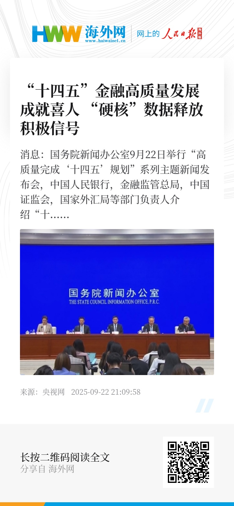 中国人民银行行长 潘功胜:截至今年6月末,中国银行业总资产近470万亿元,位居世界第一;股票、债券市场规模位居世界第二;外汇储备规模连续20年位居世界第一。我国在绿色金融、普惠金融、数字金融等方面走在世界前列,基本建成多渠道、广覆盖、安全高效的人民币跨境支付清算网络,移动支付处于国际领先水平。“十四五”期间,科技型中小企业贷款、普惠小微、绿色贷款年均增速超过20%。