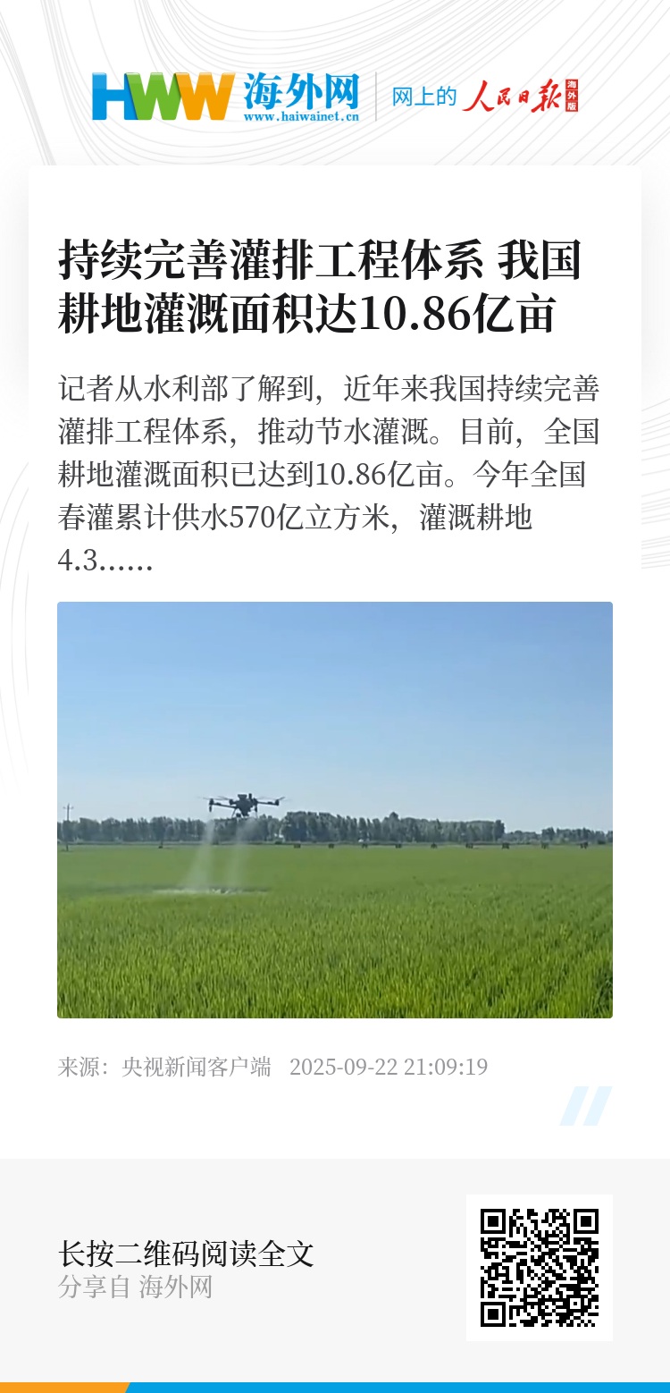 记者从水利部了解到,近年来我国持续完善灌排工程体系,推动节水灌溉。目前,全国耕地灌溉面积已达到10.86亿亩。