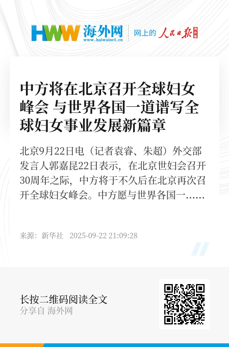 新华社北京9月22日电(记者袁睿、朱超)外交部发言人郭嘉昆22日表示,在北京世妇会召开30周年之际,中方将于不久后在北京再次召开全球妇女峰会。中方愿与世界各国一道,携手共进,加速妇女全面发展新进程,谱写全球妇女事业发展新篇章。