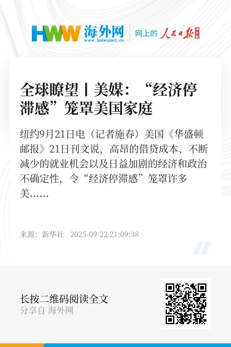 新华社纽约9月21日电(记者施春)美国《华盛顿邮报》21日刊文说,高昂的借贷成本、不断减少的就业机会以及日益加剧的经济和政治不确定性,令“经济停滞感”笼罩许多美国家庭。文章摘要如下:
