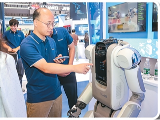 在2025世界智能产业博览会现场,工作人员向观众介绍养老机器人“小五”。全球首个养老机器人国际标准由中国牵头制定。