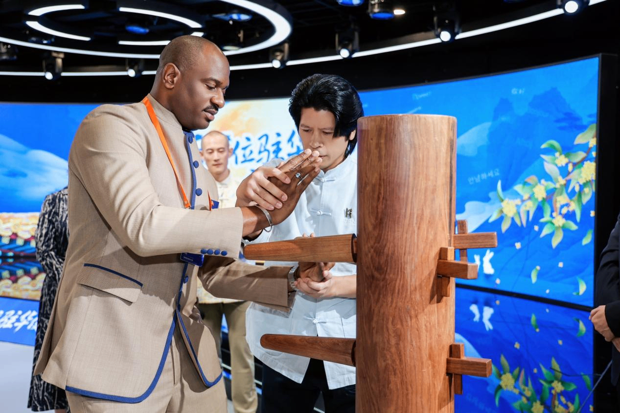 咏春拳代表性传承人郑祖杰与格林纳达驻华大使马岩互动。(海外网 谢明 摄)
