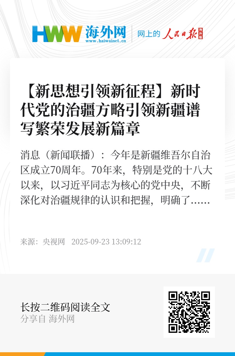 央视网消息(新闻联播):今年是新疆维吾尔自治区成立70周年。70年来,特别是党的十八大以来,以习近平同志为核心的党中央,不断深化对治疆规律的认识和把握,明确了社会稳定和长治久安总目标,确立了新时代党的治疆方略,引领新疆工作在错综复杂中守正创新、在矛盾风险中胜利前进,推动新疆各项事业取得历史性成就、发生历史性变革。一个团结和谐、繁荣富裕、文明进步、安居乐业、生态良好的美丽新疆正呈现在世人面前。
