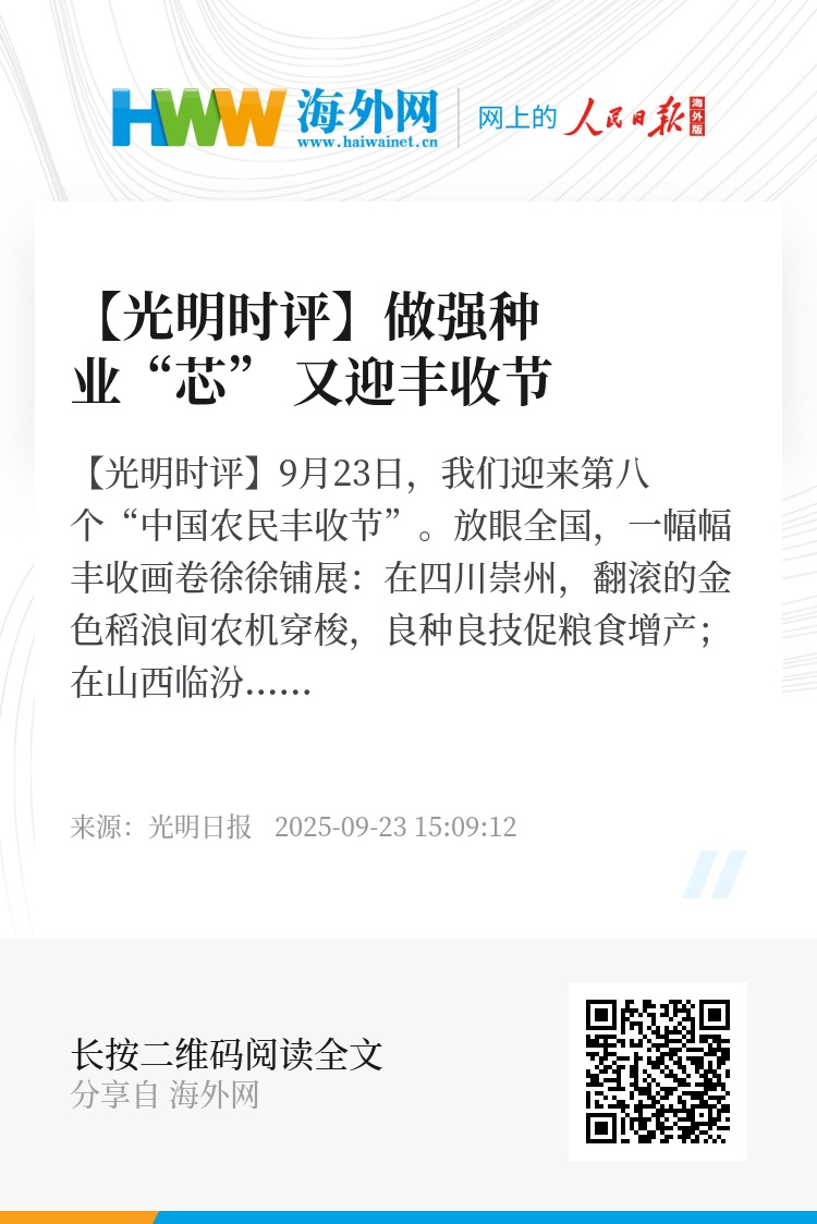 9月23日,我们迎来第八个“中国农民丰收节”。放眼全国,一幅幅丰收画卷徐徐铺展:在四川崇州,翻滚的金色稻浪间农机穿梭,良种良技促粮食增产;在山西临汾,玉露香梨缀满枝头,优良品质和独特口感助力农产品打开全国市场;在河南滑县,经历夏季持续高温考验的抗旱耐热玉米新品种迎来丰收,优秀的抗逆特性为农民增产增收注入信心……