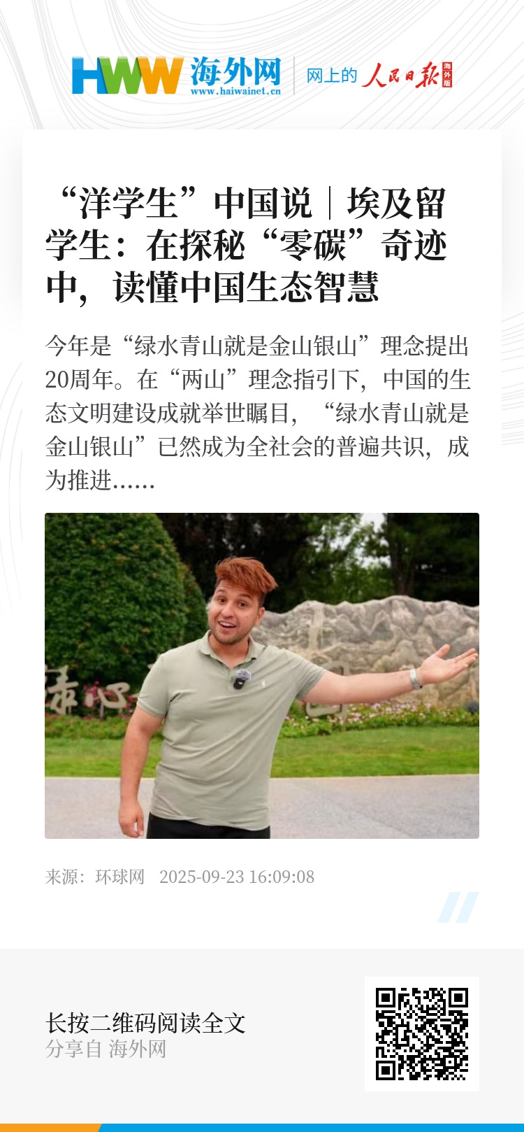 今年是“绿水青山就是金山银山”理念提出20周年。在“两山”理念指引下,中国的生态文明建设成就举世瞩目,“绿水青山就是金山银山”已然成为全社会的普遍共识,成为推进生态文明建设的强大动力。值此之际,埃及留学生桑英杰打卡北京城市副中心,探索科技与自然融合下的“零碳”奥秘。