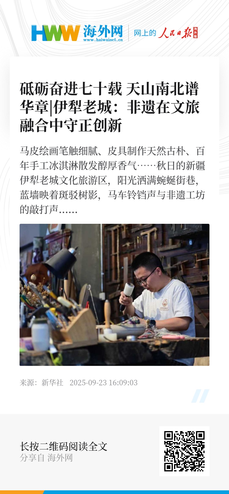 马皮绘画笔触细腻、皮具制作天然古朴、百年手工冰淇淋散发醇厚香气……秋日的新疆伊犁老城文化旅游区,阳光洒满蜿蜒街巷,蓝墙映着斑驳树影,马车铃铛声与非遗工坊的敲打声交织。