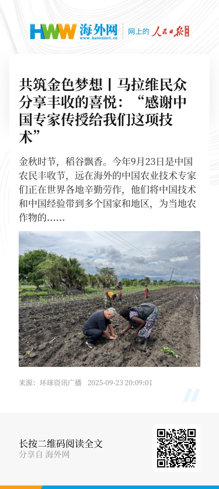 金秋时节,稻谷飘香。今年9月23日是中国农民丰收节,远在海外的中国农业技术专家们正在世界各地辛勤劳作,他们将中国技术和中国经验带到多个国家和地区,为当地农作物的增产丰收贡献力量。