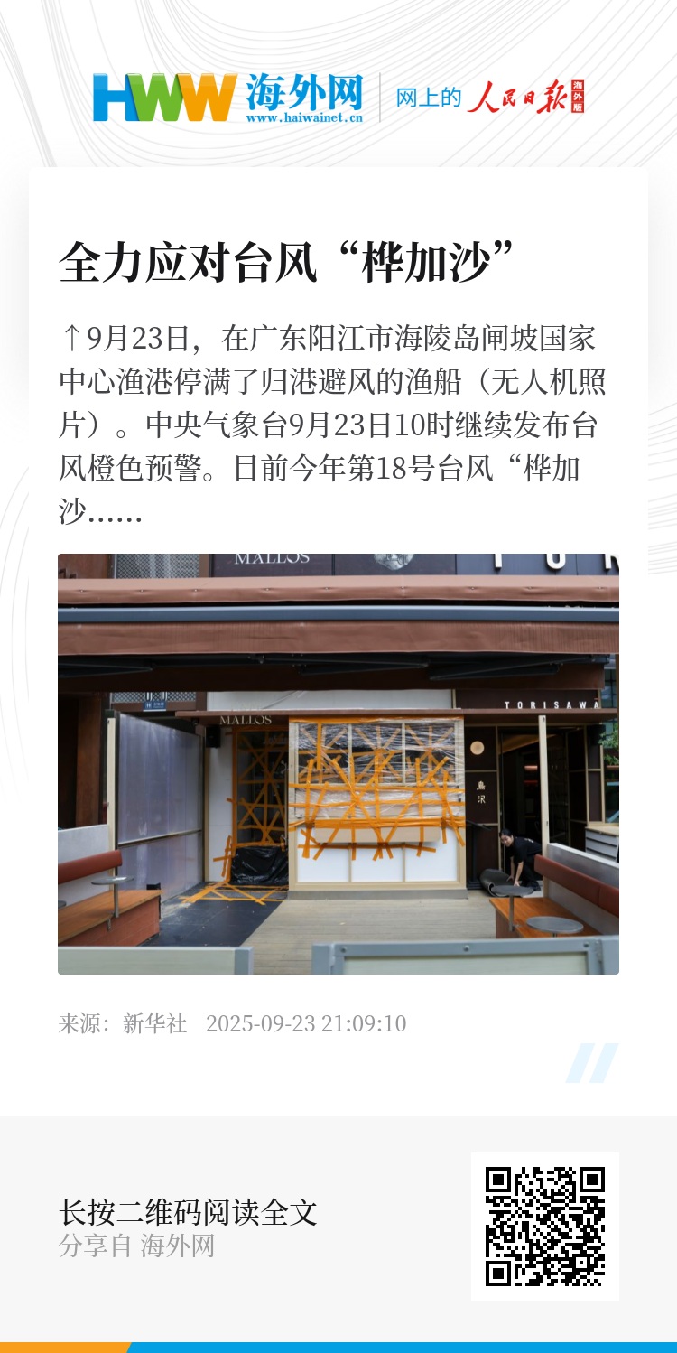 中央气象台9月23日10时继续发布台风橙色预警。目前今年第18号台风“桦加沙”正逐渐逼近广东,广东省防总决定于当日10时将防风Ⅱ级应急响应提升为防风Ⅰ级应急响应。广东各地采取措施加强防范应对,保障人民群众生命财产安全。