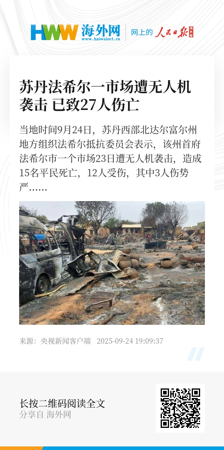 当地时间9月24日,苏丹西部北达尔富尔州地方组织法希尔抵抗委员会表示,该州首府法希尔市一个市场23日遭无人机袭击,造成15名平民死亡,12人受伤,其中3人伤势严重。