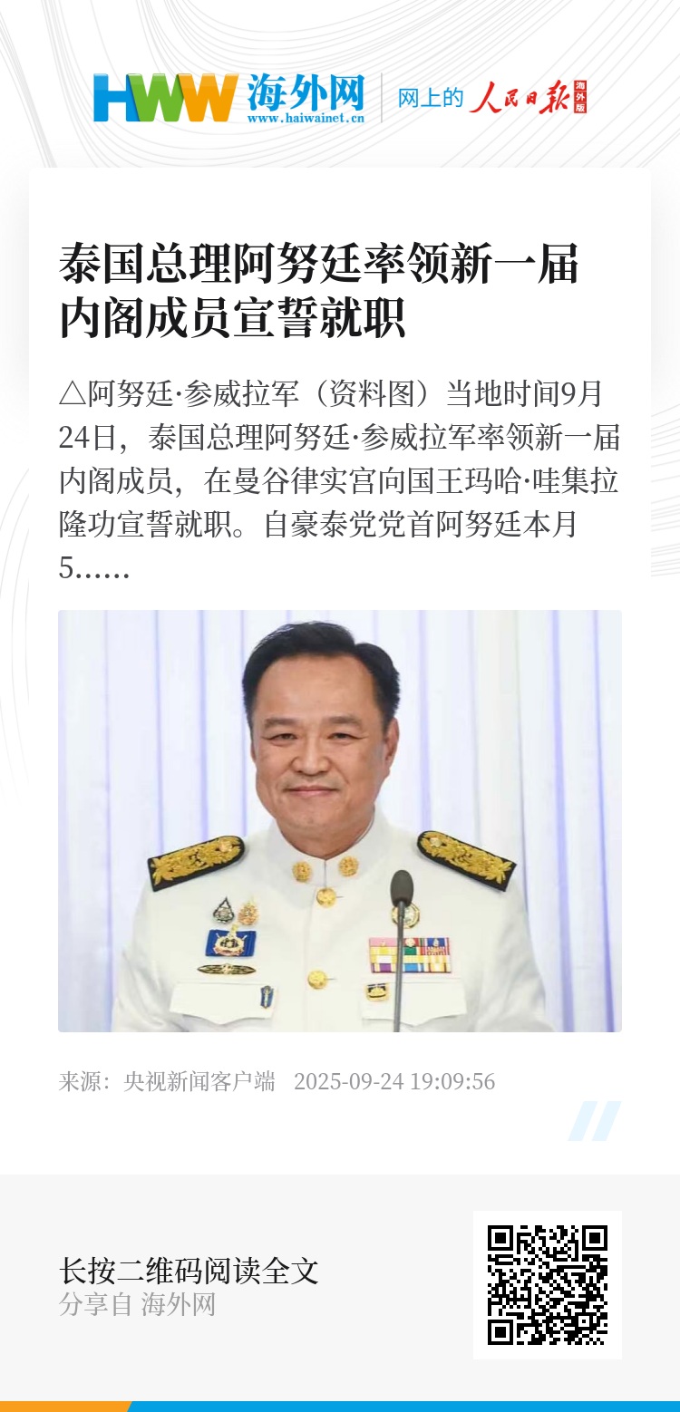 自豪泰党党首阿努廷本月5日在国会下议院特别会议投票中获得过半数支持,当选新一任泰国总理,并于7日获国王批准。泰国皇家公报网站当地时间9月19日公布国王谕令,宣布国王玛哈·哇集拉隆功已批准新任总理阿努廷提交的新政府内阁名单,同时宣布新内阁成员组成。(总台记者 宋焕钰)