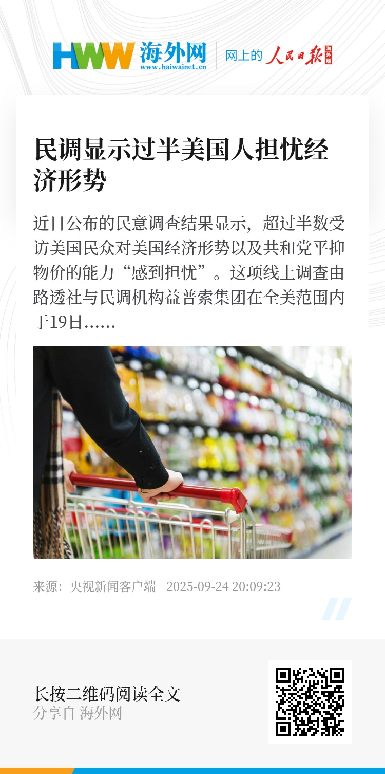 近日公布的民意调查结果显示,超过半数受访美国民众对美国经济形势以及共和党平抑物价的能力“感到担忧”。