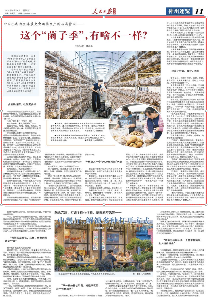 “在人才培养方面,《普通高等学校本科专业目录(2025年)》设置了菌物科学与工程、食用菌科学与工程等专业。在标准制定方面,中国近年发布实施食用菌相关国家标准、农业行业标准20余项,并结合绿色高产高效行动,在优势产区集成推广食用菌标准化生产关键技术。中国还支持山西等11个省份自主开展食用菌等农业微生物种质资源普查,强化食用菌资源收集。”曹慧说。