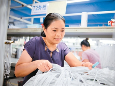 湖南省邵阳市城步苗族自治县推出税收优惠等一揽子政策,促进群众就业。图为工人在当地一家企业赶制数据线产品。