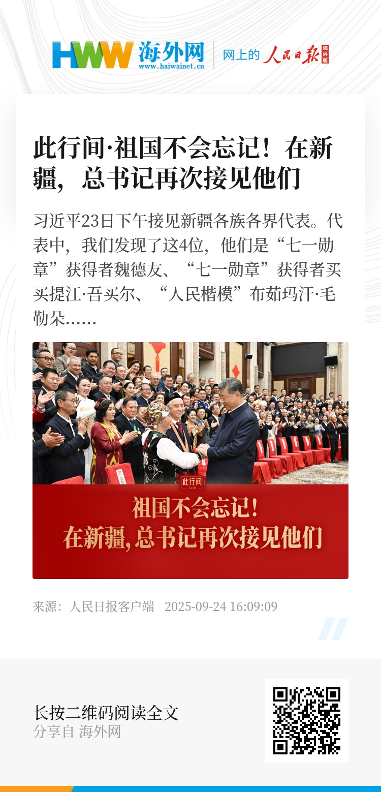习近平23日下午接见新疆各族各界代表。代表中,我们发现了这4位,他们是“七一勋章”获得者魏德友、“七一勋章”获得者买买提江·吾买尔、“人民楷模”布茹玛汗·毛勒朵、“人民卫士”巴依卡·凯力迪别克。习近平总书记微笑着同他们亲切握手。