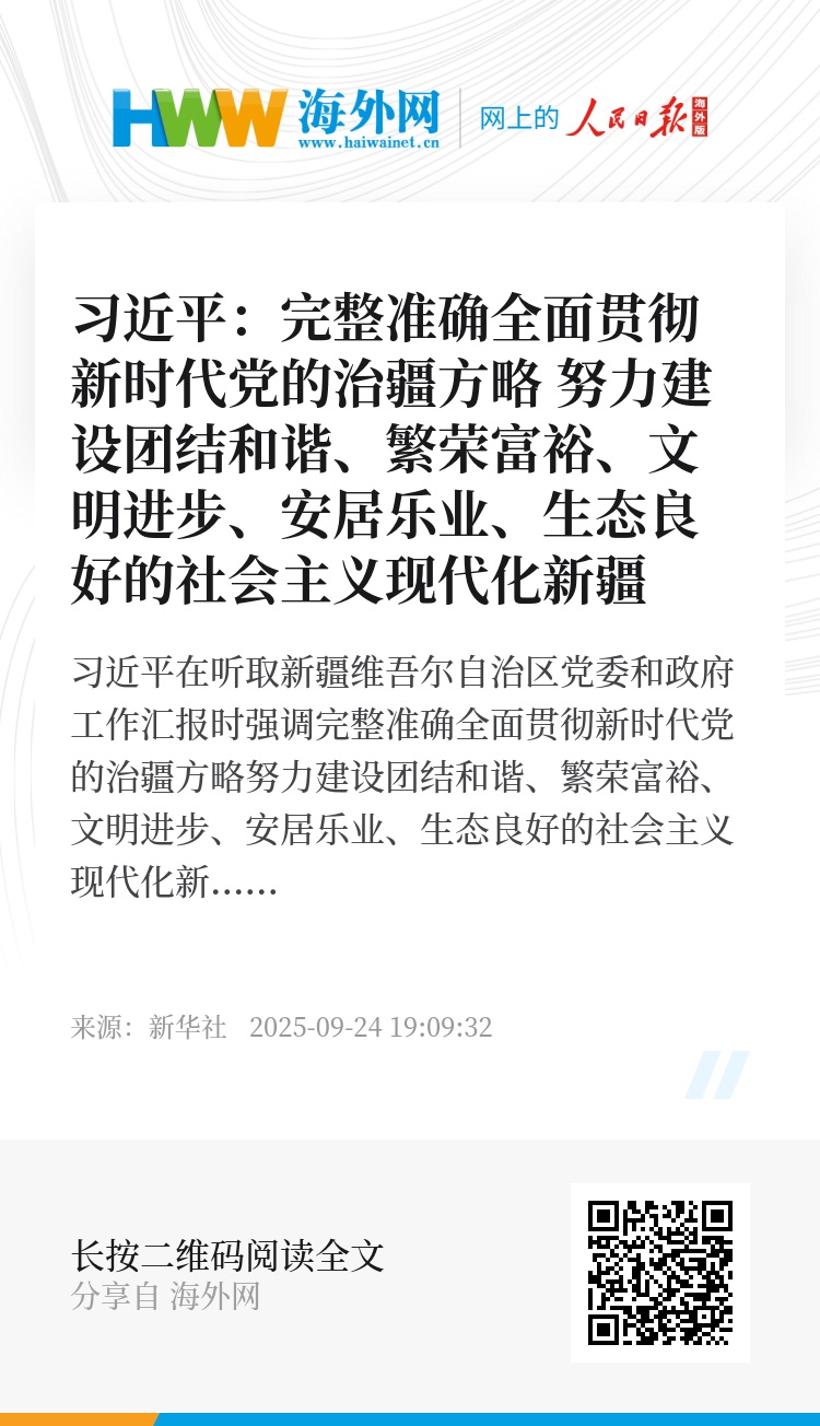 新华社乌鲁木齐9月24日电 率中央代表团出席新疆维吾尔自治区成立70周年庆祝活动的中共中央总书记、国家主席、中央军委主席习近平,24日听取新疆维吾尔自治区党委和政府工作汇报。他强调,新疆要完整准确全面贯彻新时代党的治疆方略,坚持稳中求进工作总基调,统筹发展和安全,牢牢扭住社会稳定和长治久安工作总目标,紧紧围绕铸牢中华民族共同体意识、推进中华民族共同体建设,锚定中央赋予的“五大战略定位”,凝心聚力、久久为功,努力建设团结和谐、繁荣富裕、文明进步、安居乐业、生态良好的社会主义现代化新疆。