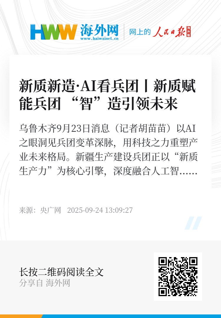央广网乌鲁木齐9月23日消息(记者胡苗苗)以AI之眼洞见兵团变革深脉,用科技之力重塑产业未来格局。新疆生产建设兵团正以“新质生产力”为核心引擎,深度融合人工智能、大数据等前沿技术,既以科技为翼突破发展边界,更以绿色为基筑牢生态底色,从传统工业的迭代升级到新质生产力的全链构建,稳步铸就多元协同的现代化产业矩阵。