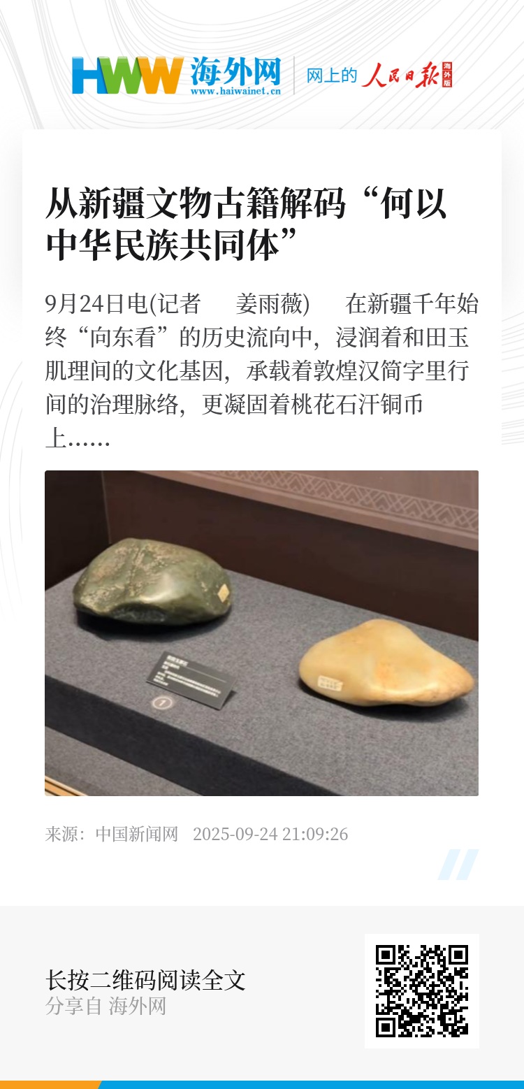 中新网9月24日电(记者 姜雨薇) 在新疆千年始终“向东看”的历史流向中,浸润着和田玉肌理间的文化基因,承载着敦煌汉简字里行间的治理脉络,更凝固着桃花石汗铜币上的认同标识……从玉石之路到丝绸之路,从龟兹求医到库尔班献花,新疆与中原地区的联系与交流从未中断。