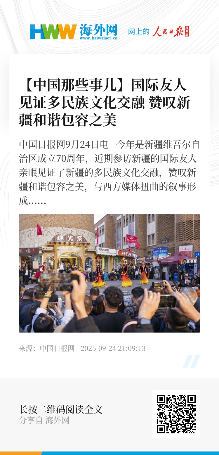 中国日报网9月24日电 今年是新疆维吾尔自治区成立70周年,近期参访新疆的国际友人亲眼见证了新疆的多民族文化交融,赞叹新疆和谐包容之美,与西方媒体扭曲的叙事形成鲜明对比。