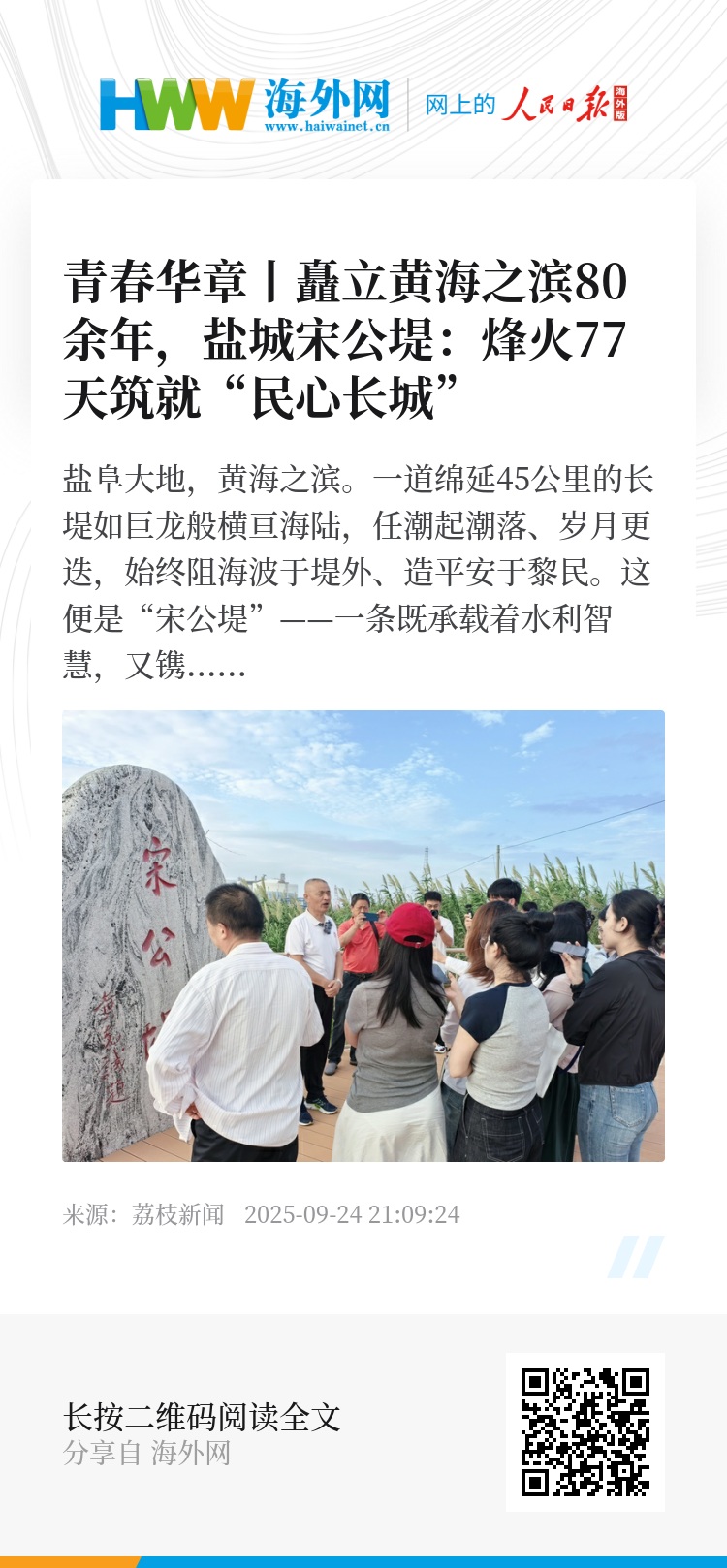 这份守护与发展,也让宋公堤收获了更多认可。2021年,宋公堤入选首批省级水利遗产名录,成为展现江苏治水历史的重要载体;2023年,跻身水利部“人民治水·百年功绩”治水工程项目榜单,成为全国红色水利教育基地。如今站在宋公堤上,一边是波涛汹涌的黄海,一边是生机勃勃的城镇与田野,这条古堤成了盐城沿海水利体系、生态体系、发展体系的“精神原点”。