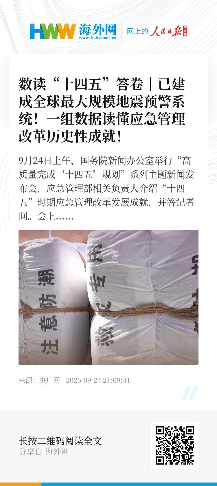 9月24日上午,国务院新闻办公室举行“高质量完成‘十四五’规划”系列主题新闻发布会,应急管理部相关负责人介绍“十四五”时期应急管理改革发展成就,并答记者问。会上介绍,重特大事故起数首次下降到个位数,完成第一次全国自然灾害综合风险普查,基本实现省市县应急物资储备库全覆盖……戳图!一组数据读懂应急管理改革历史性成就!