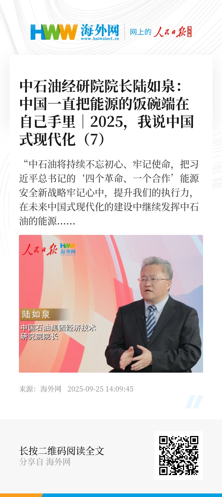 “中石油将持续不忘初心、牢记使命,把习近平总书记的‘四个革命、一个合作’能源安全新战略牢记心中,提升我们的执行力,在未来中国式现代化的建设中继续发挥中石油的能源力量、石油力量。”中国石油集团经济技术研究院院长陆如泉日前接受人民日报海外网专访时说。