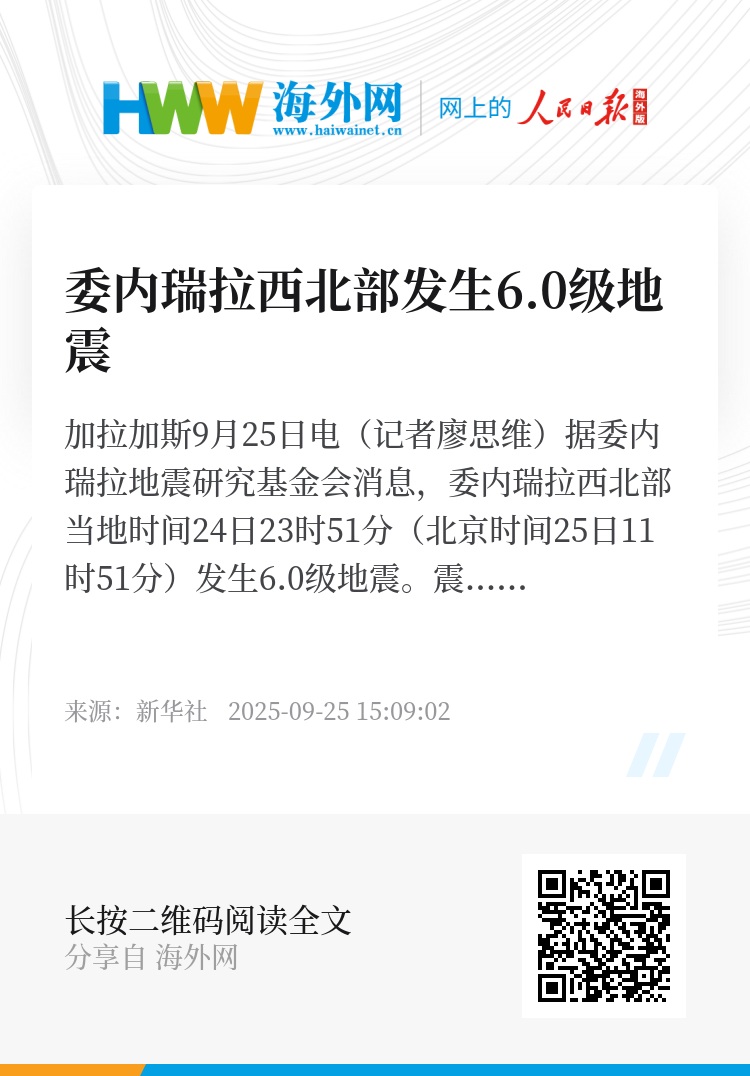 新华社加拉加斯9月25日电(记者廖思维)据委内瑞拉地震研究基金会消息,委内瑞拉西北部当地时间24日23时51分(北京时间25日11时51分)发生6.0级地震。震中位于苏利亚州巴查克罗东部45公里,震源深度16.4公里。目前尚无人员伤亡和财产损失报告。