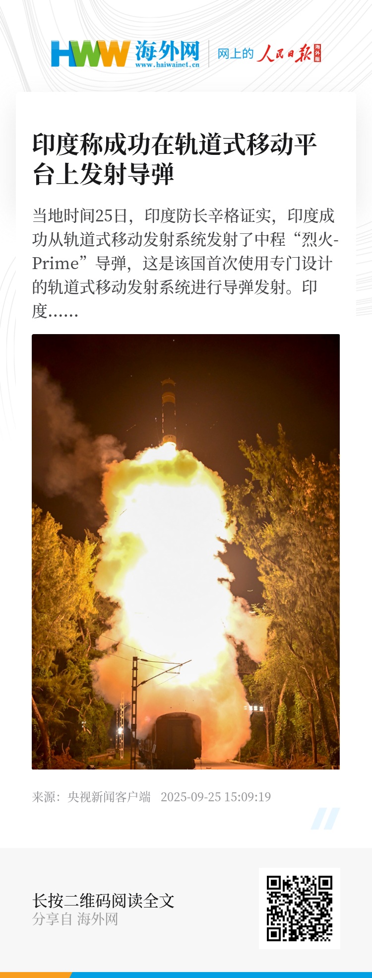 当地时间25日,印度防长辛格证实,印度成功从轨道式移动发射系统发射了中程“烈火-Prime”导弹,这是该国首次使用专门设计的轨道式移动发射系统进行导弹发射。