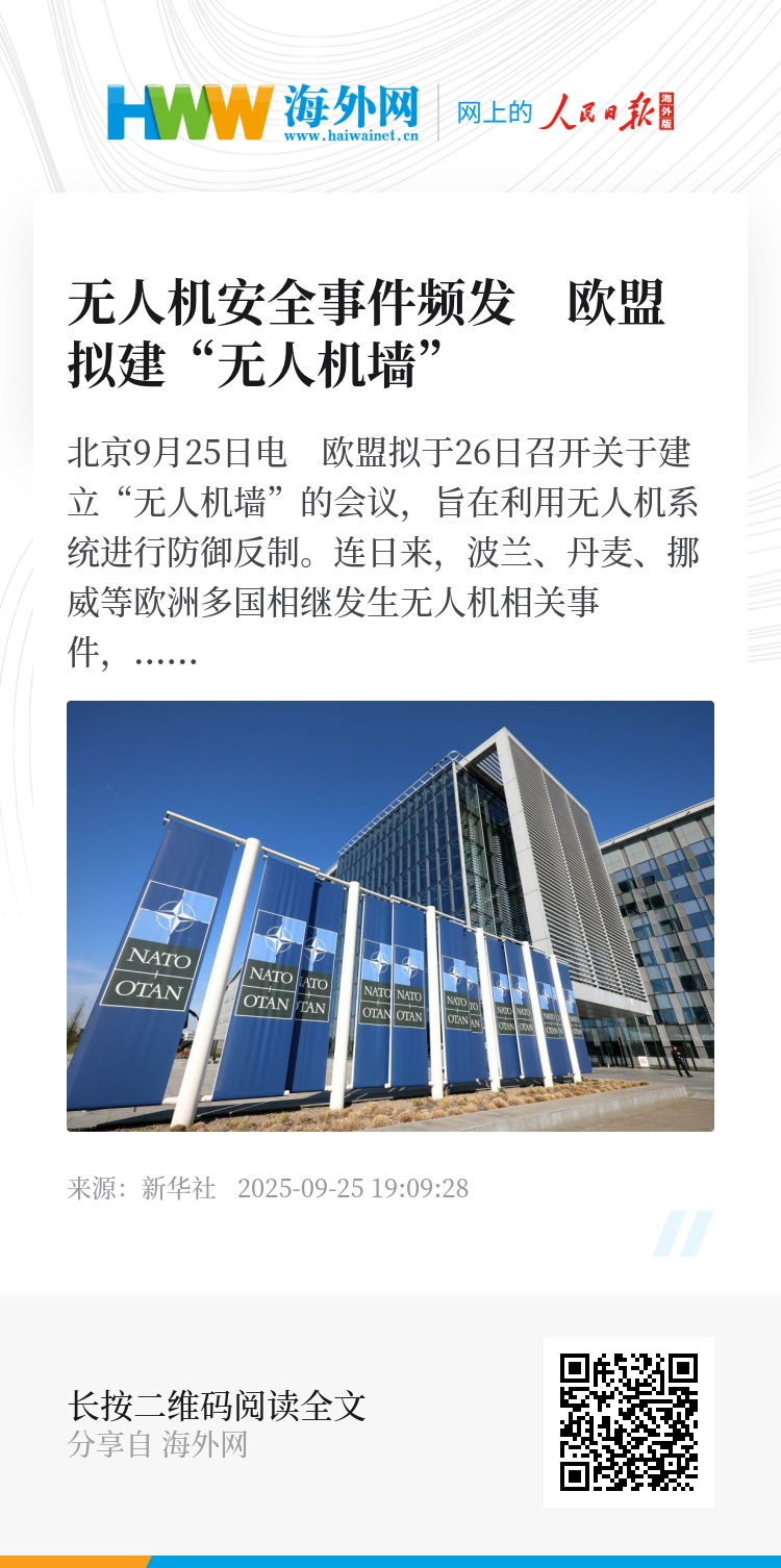 新华社北京9月25日电 欧盟拟于26日召开关于建立“无人机墙”的会议,旨在利用无人机系统进行防御反制。连日来,波兰、丹麦、挪威等欧洲多国相继发生无人机相关事件,引发欧洲对自身安全和北约东翼局势的担忧。