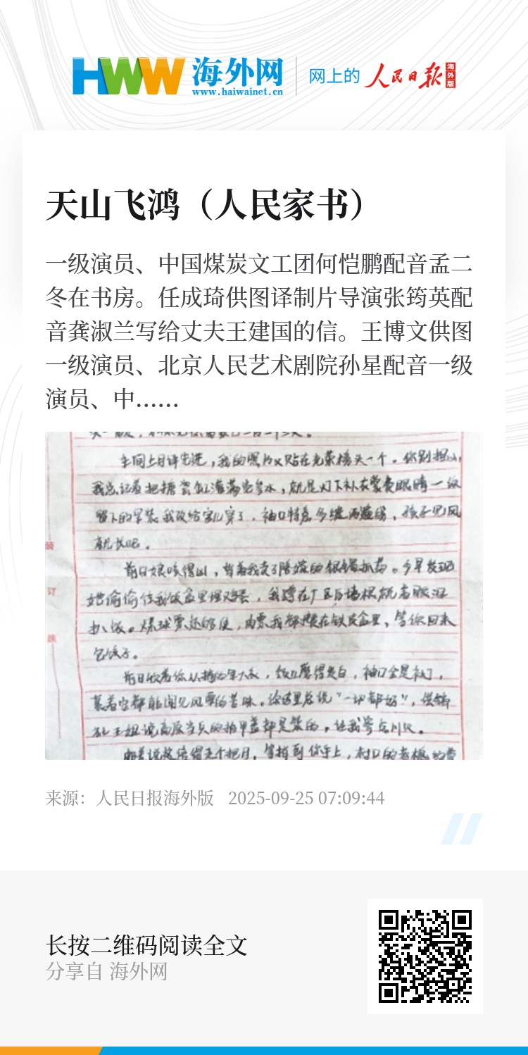 在这个特别的时刻,本报“人民家书”将目光投向广袤的新疆,摘编4封跨越时空的“新疆家书”——梁狄刚在致母亲的信中表明志向并在今后的岁月中以行动践行,他在塔里木盆地的坚守就是生动的注脚;在石河子大学支教的北京大学教授孟二冬在写给妻子的信里尽显师者仁心;军嫂淑兰告诉戍边的丈夫“家里这杆红旗,我扛得住”;维吾尔族姑娘古丽米热·艾尔肯和父母分享大学生活的美好。