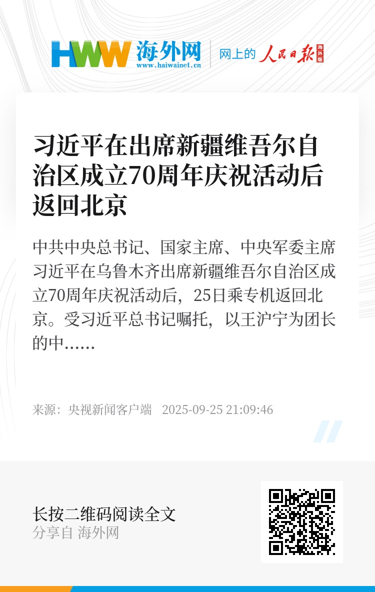 中共中央总书记、国家主席、中央军委主席习近平在乌鲁木齐出席新疆维吾尔自治区成立70周年庆祝活动后,25日乘专机返回北京。受习近平总书记嘱托,以王沪宁为团长的中央代表团将于25日至28日在新疆各地看望慰问各族各界干部群众。