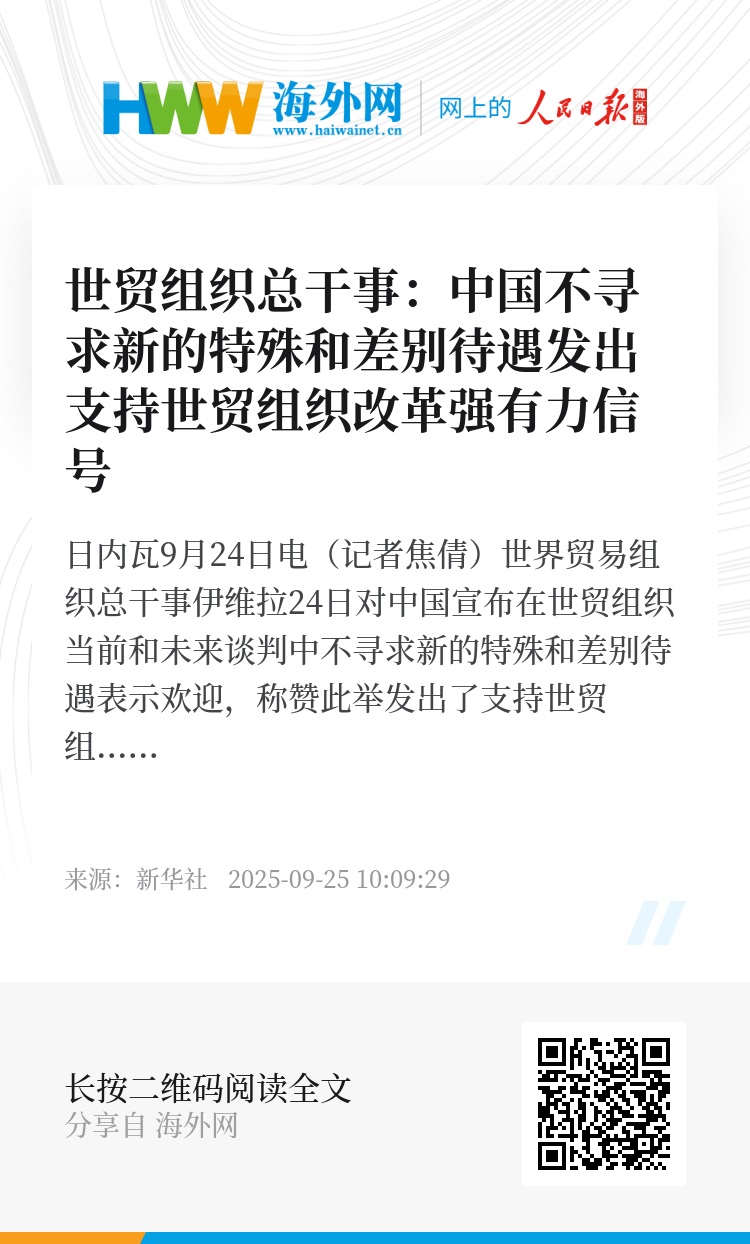 美国当地时间9月23日,在纽约联合国总部由中方主办的全球发展倡议高级别会议上,中方宣布:中国作为负责任的发展中大国,在世贸组织当前和未来谈判中将不寻求新的特殊和差别待遇。