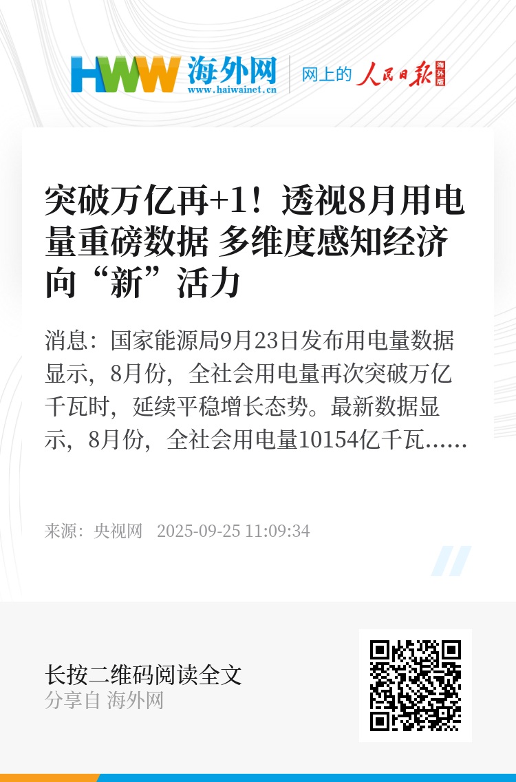 中国电力企业联合会常务副理事长杨昆介绍,2025年7月之后,8月份全国全社会用电量再次超过万亿千瓦时,连续两月创历史新高。一方面与夏季高温天气直接相关,另一方面在国家“两新”“两重”促消费等一系列政策拉动下,各行业产能持续释放。